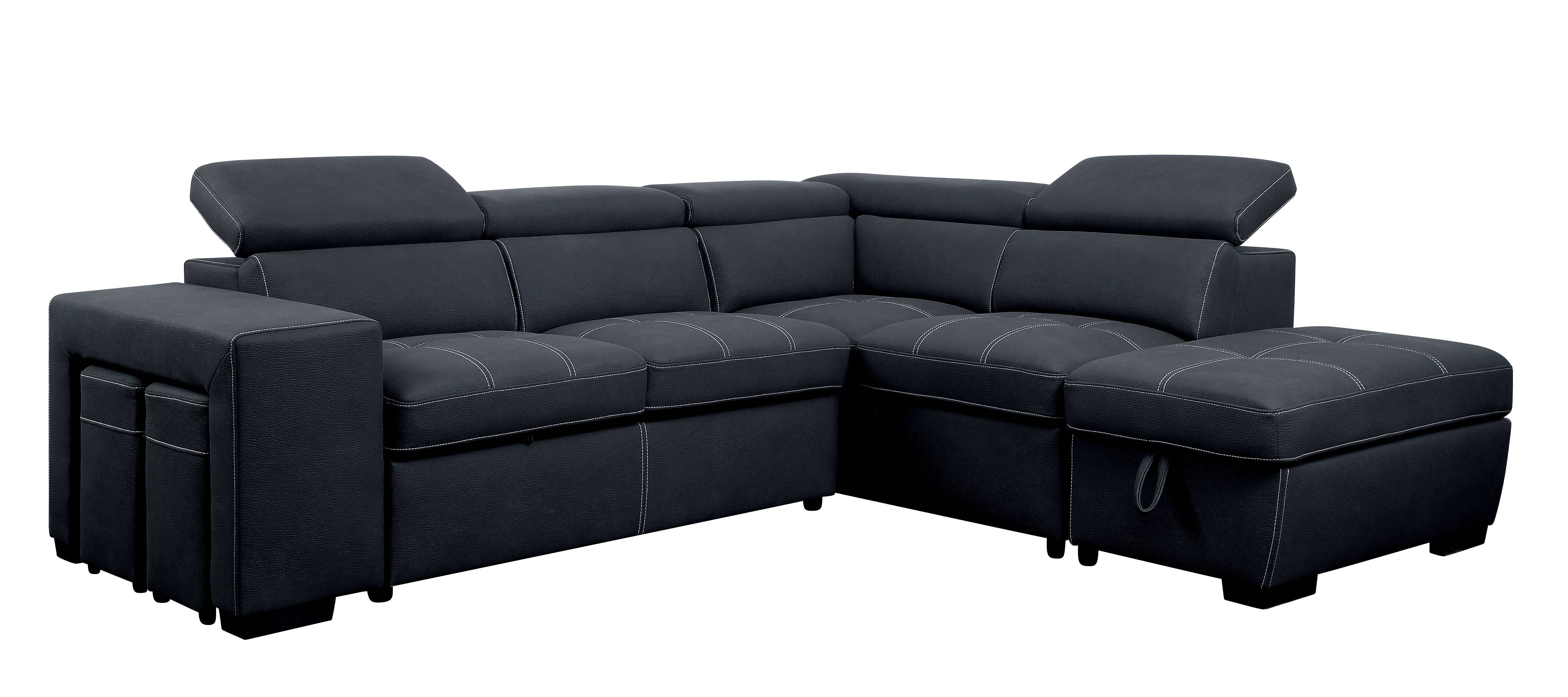 Contemporary style, Sectional Modern sectional doubling as a pull-out sleeper sofa Attached storage chaise Two (2) small ottomans underneath attached table ledge Storage underneath select adjustable headrests Graphite
