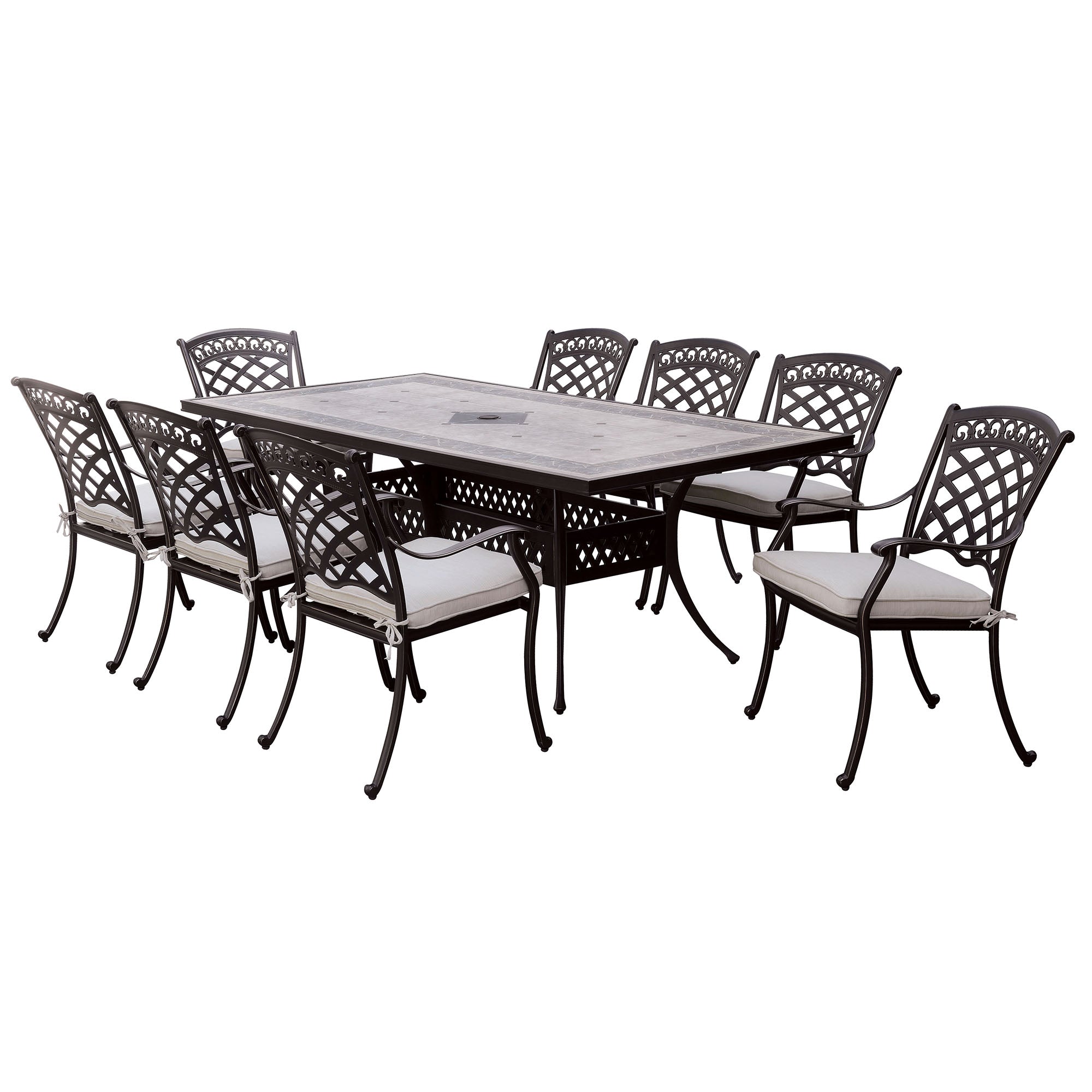Patio Dining Set. Transitional style Rectangle table top with umbrella-ready convenience Mosaic table top detail Fabric padded seat cushion on chairs with scrolled arms