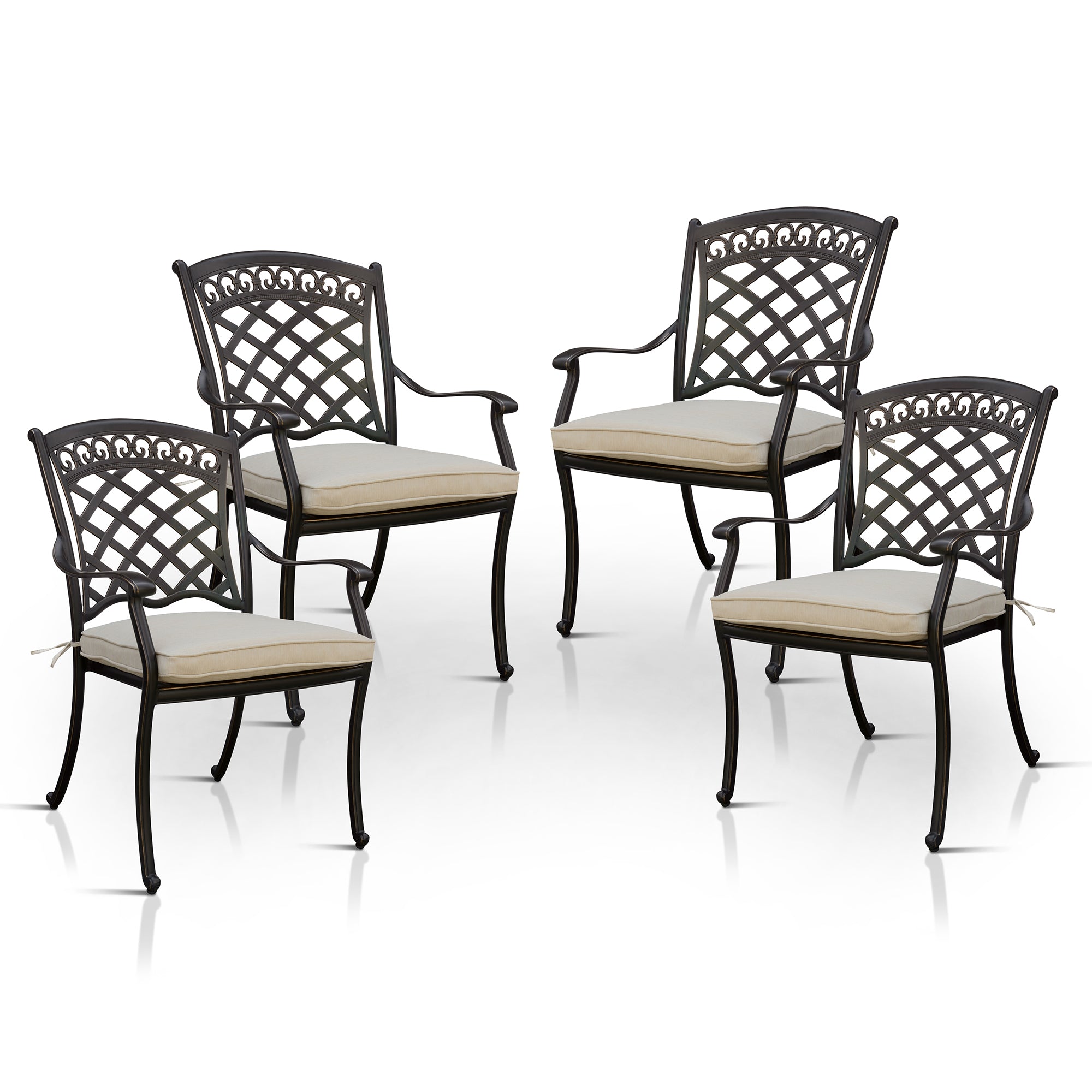 Patio Arm Chairs. Transitional style Removable seat cushion Fabric padded seat cushion Aluminum frame Scrolled feet and armrest Antique Black, Beige