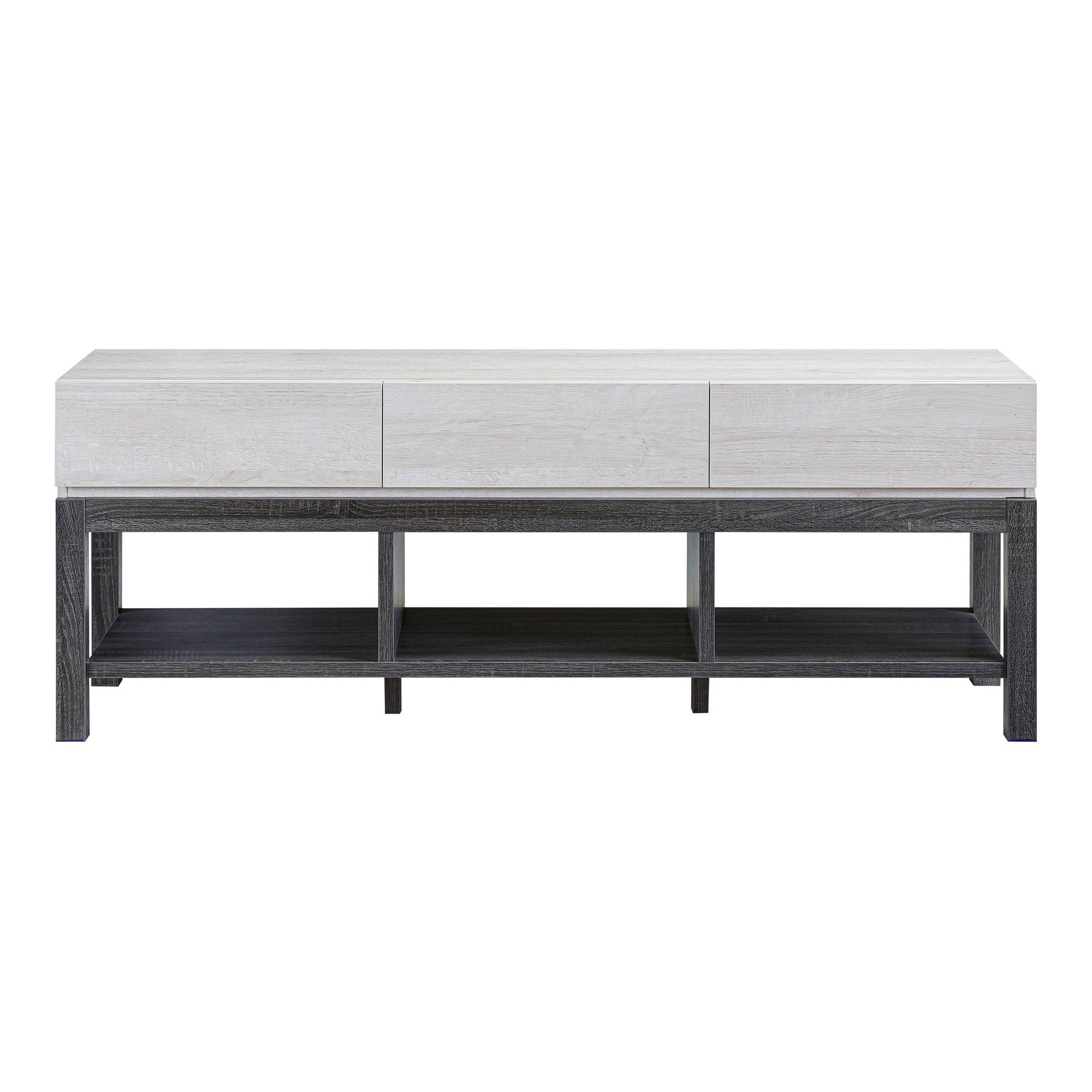 xTV Stand, Modern style Three open shelves Extra support legs Spacious surface Three spacious drawers White Oak, Distressed Gray