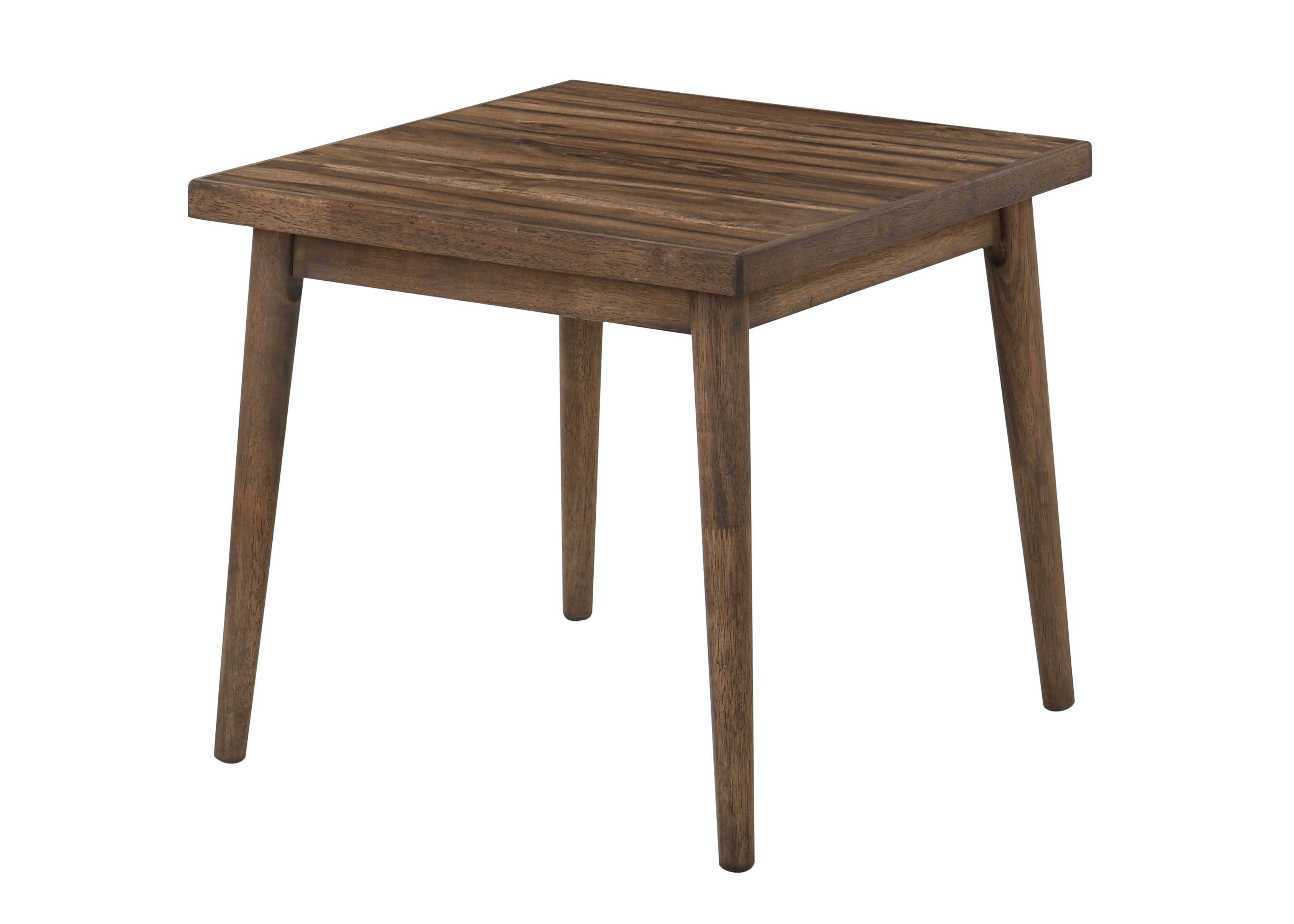 End Table, Dimensions: 23.63"L x 23.63"W x 22"H Mid-Century style Plank style tabletop exudes rustic charm Wood grain accents add classic appeal Works well in most any room, from bedrooms to living rooms and more Walnut