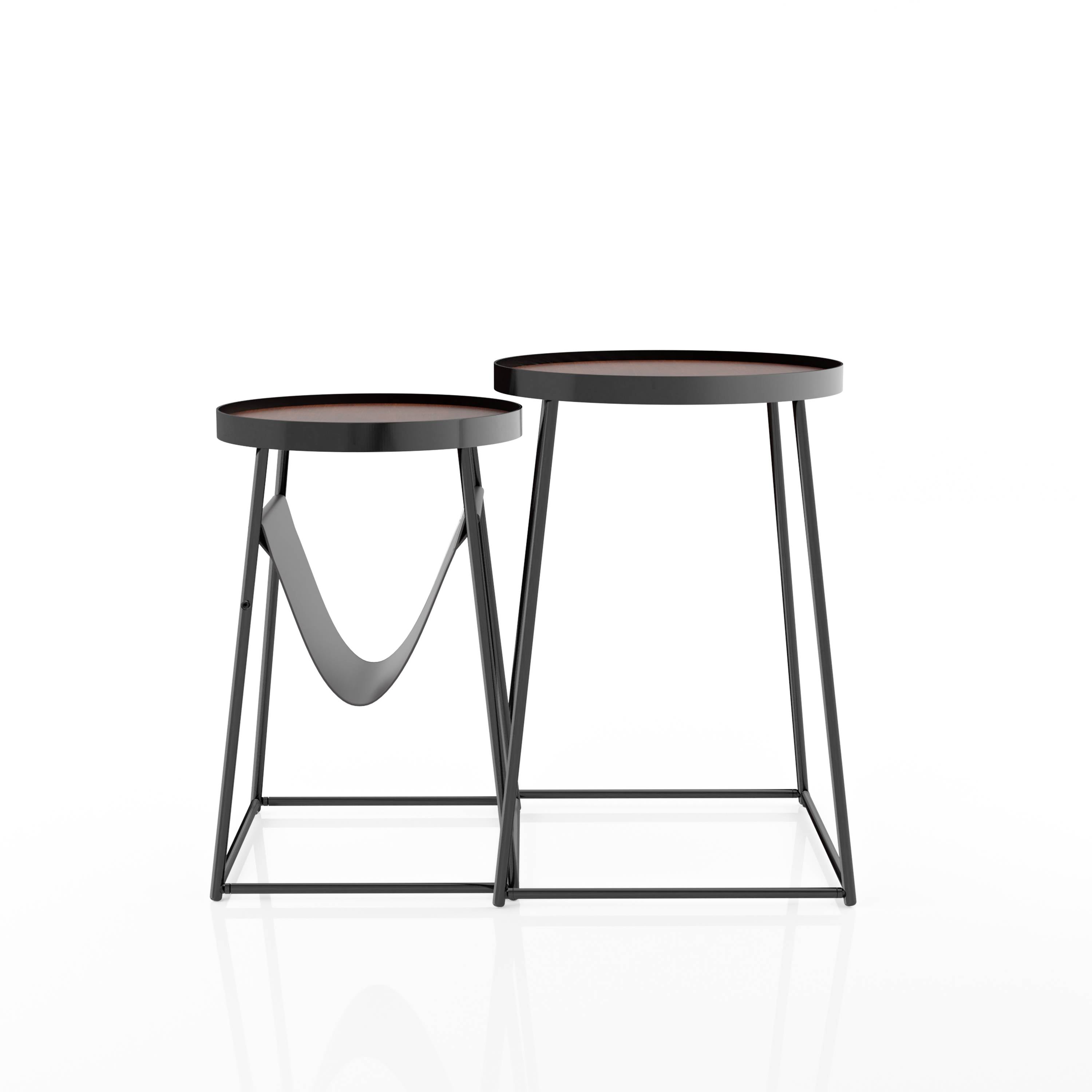 x2-Piece Nesting Tables, Modern style Round surface Flared base Raised table edge Two-tone design Walnut, Matte Black