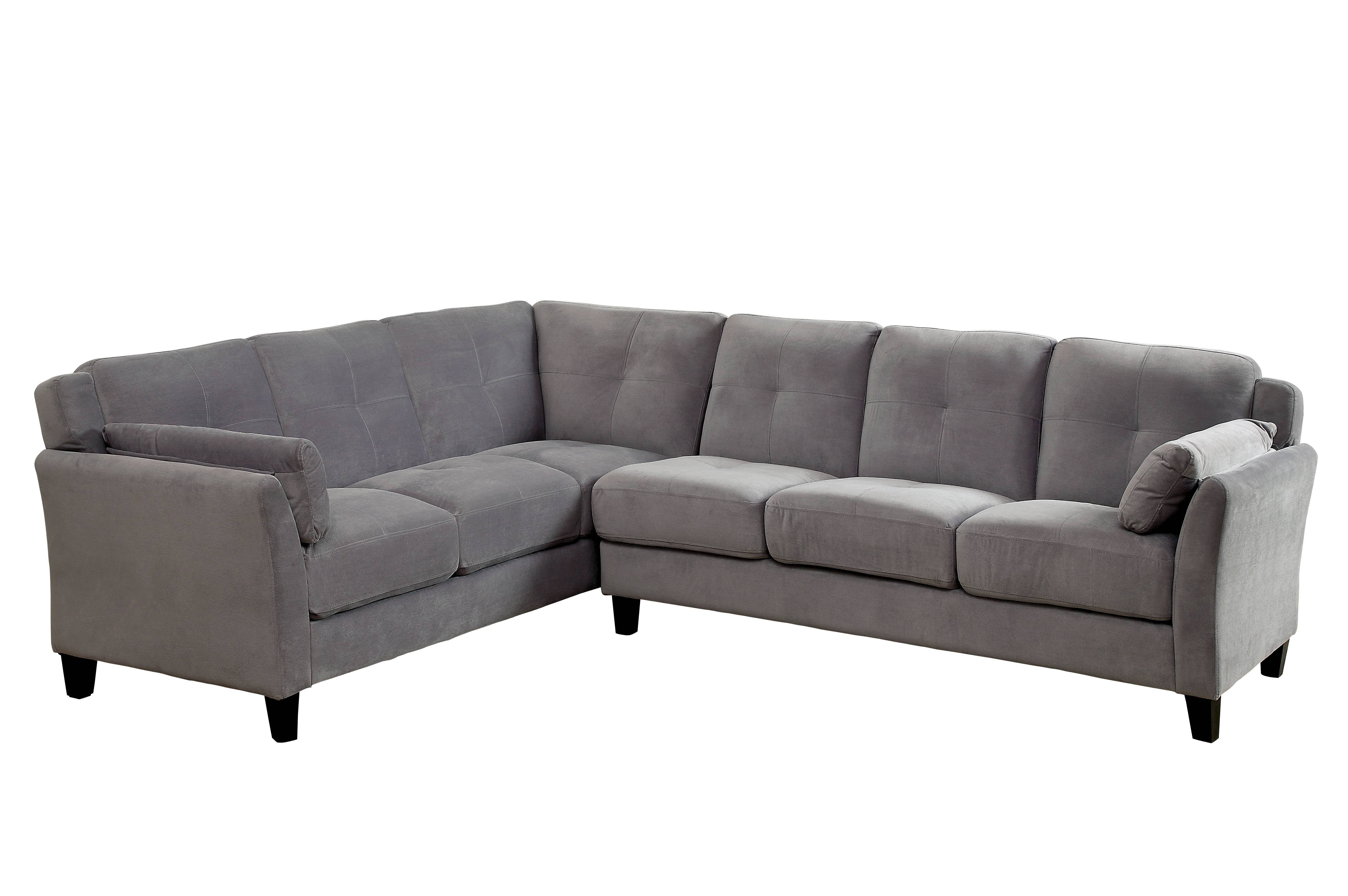 Contemporary style, Sectional Plush padded flannelette fabric upholstery Tufted backrest and seat cushions Pillow-like inside armrests Space saving L-shaped design Warm Gray