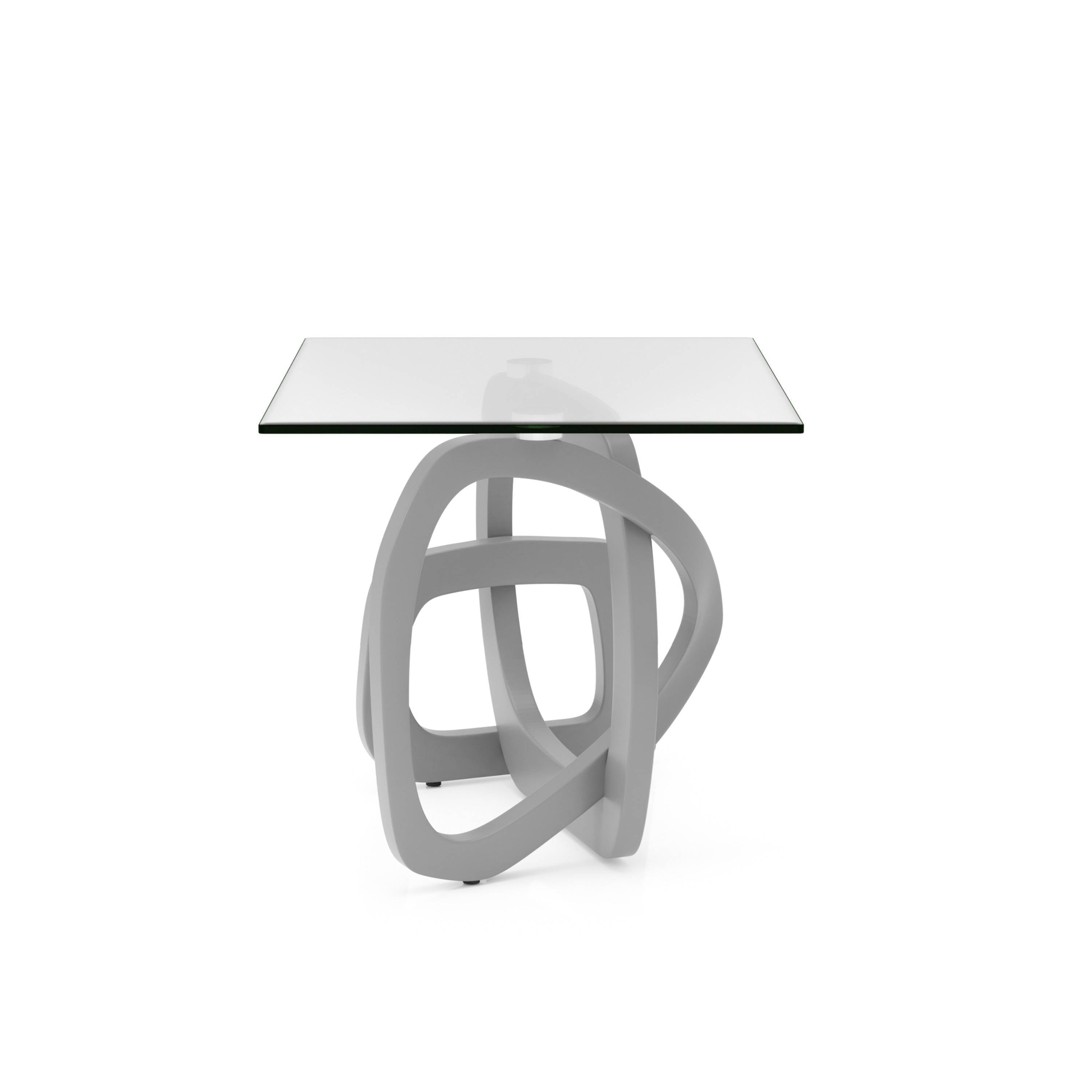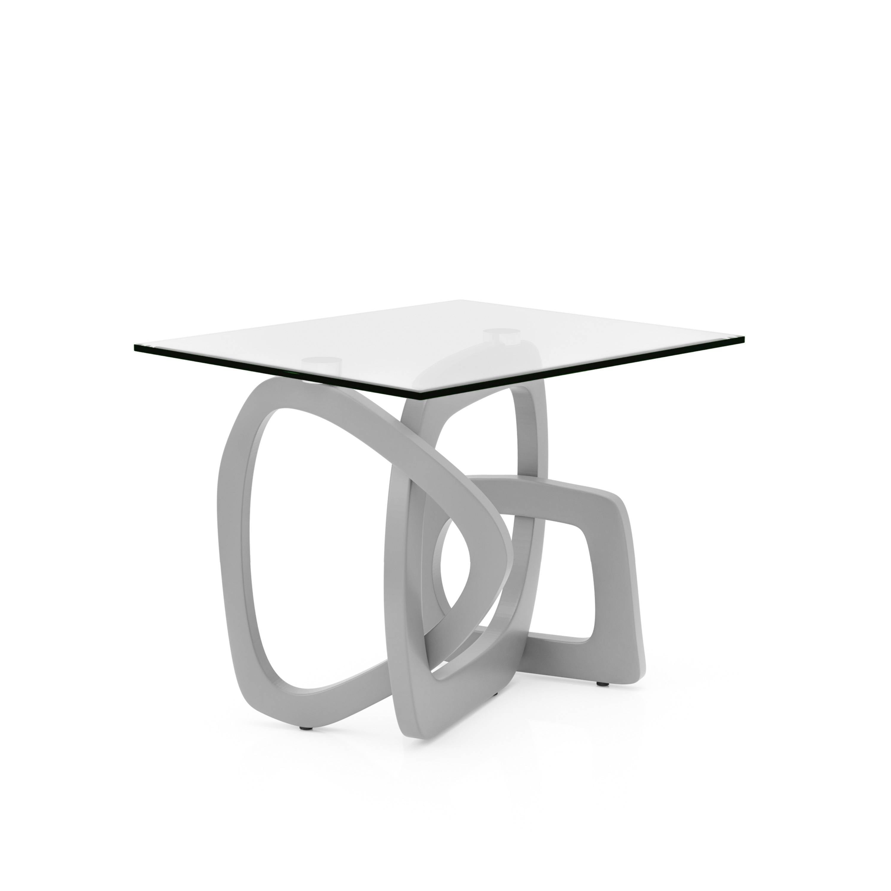 xEnd Table, Modern style Square glass shape offers ample space for drinks or books Dynamic interlocking geometric shape base design 3-discs support tabletop on base Champagne