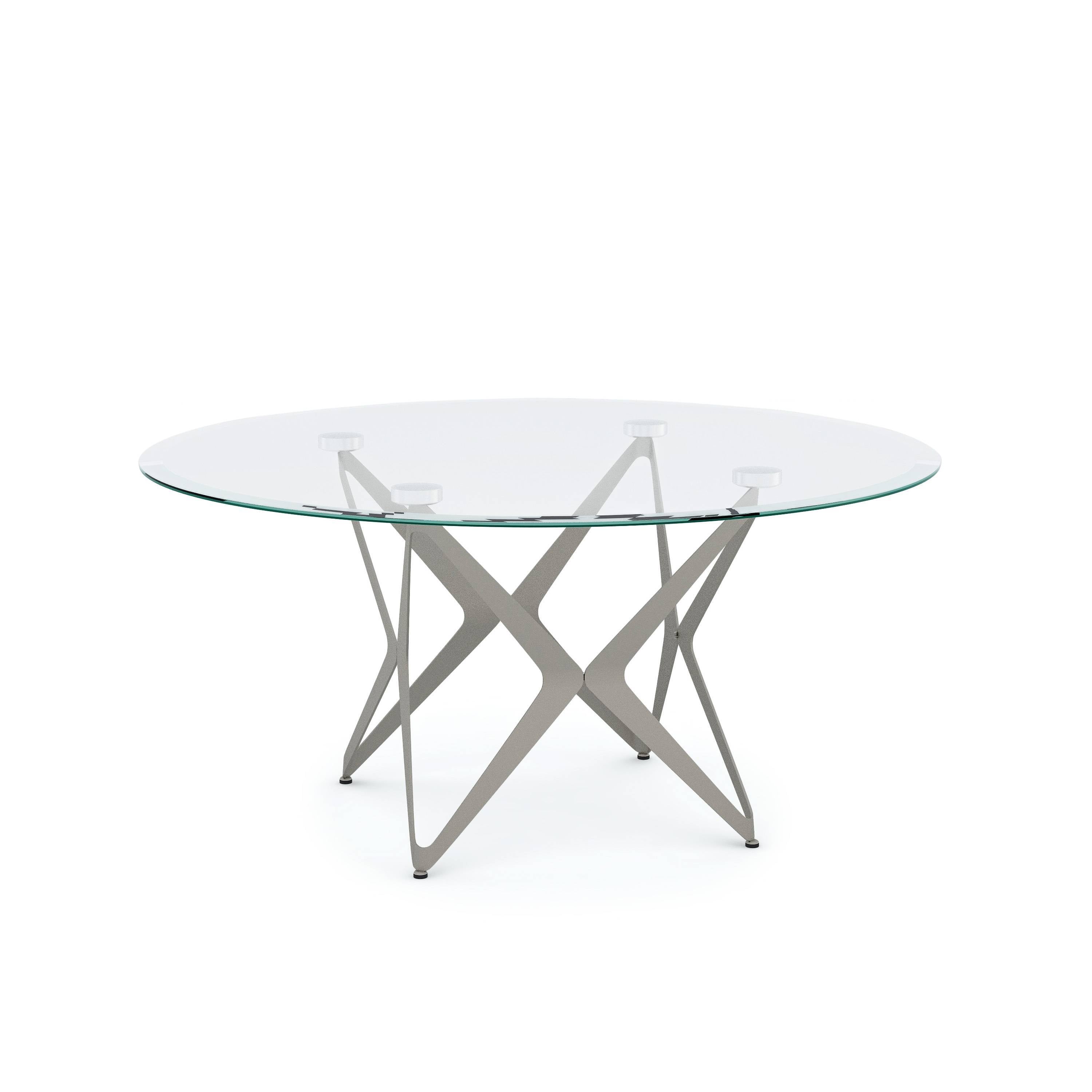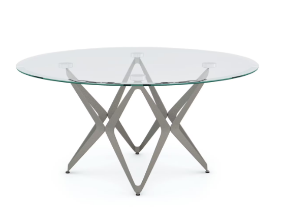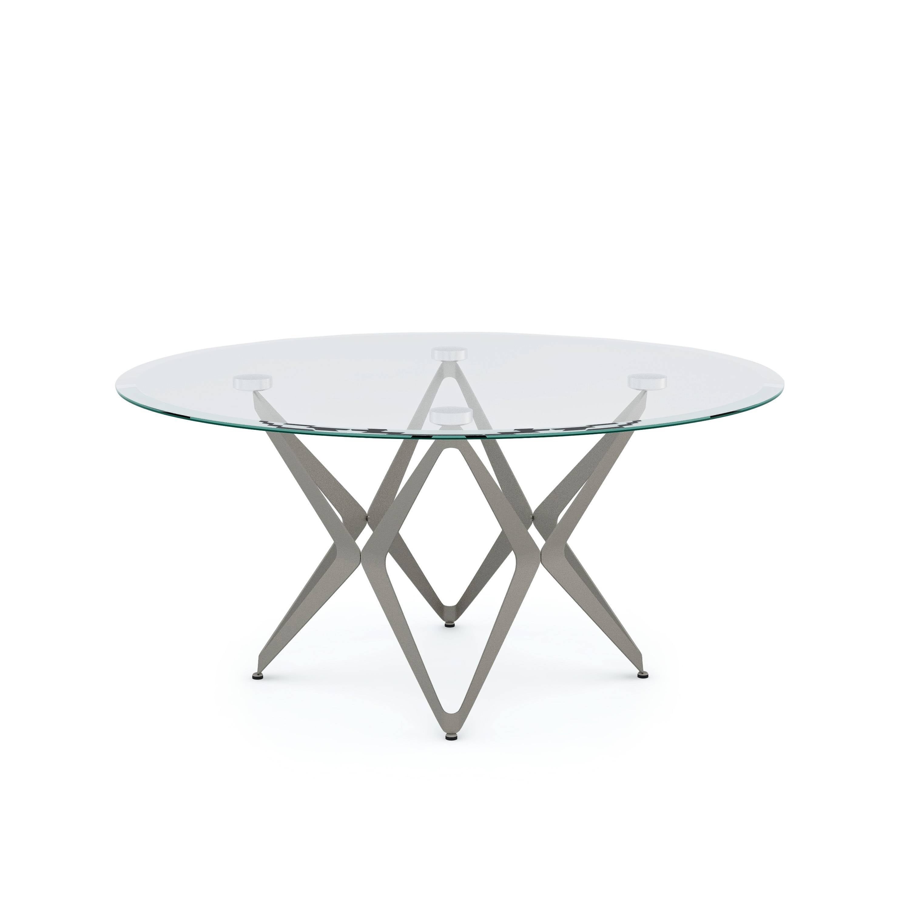 Coffee Table, Modern style Round shape works with many seating arrangements Steel base with boomerang-inspired motif Angled leg shapes around base add retro vibe Champagne