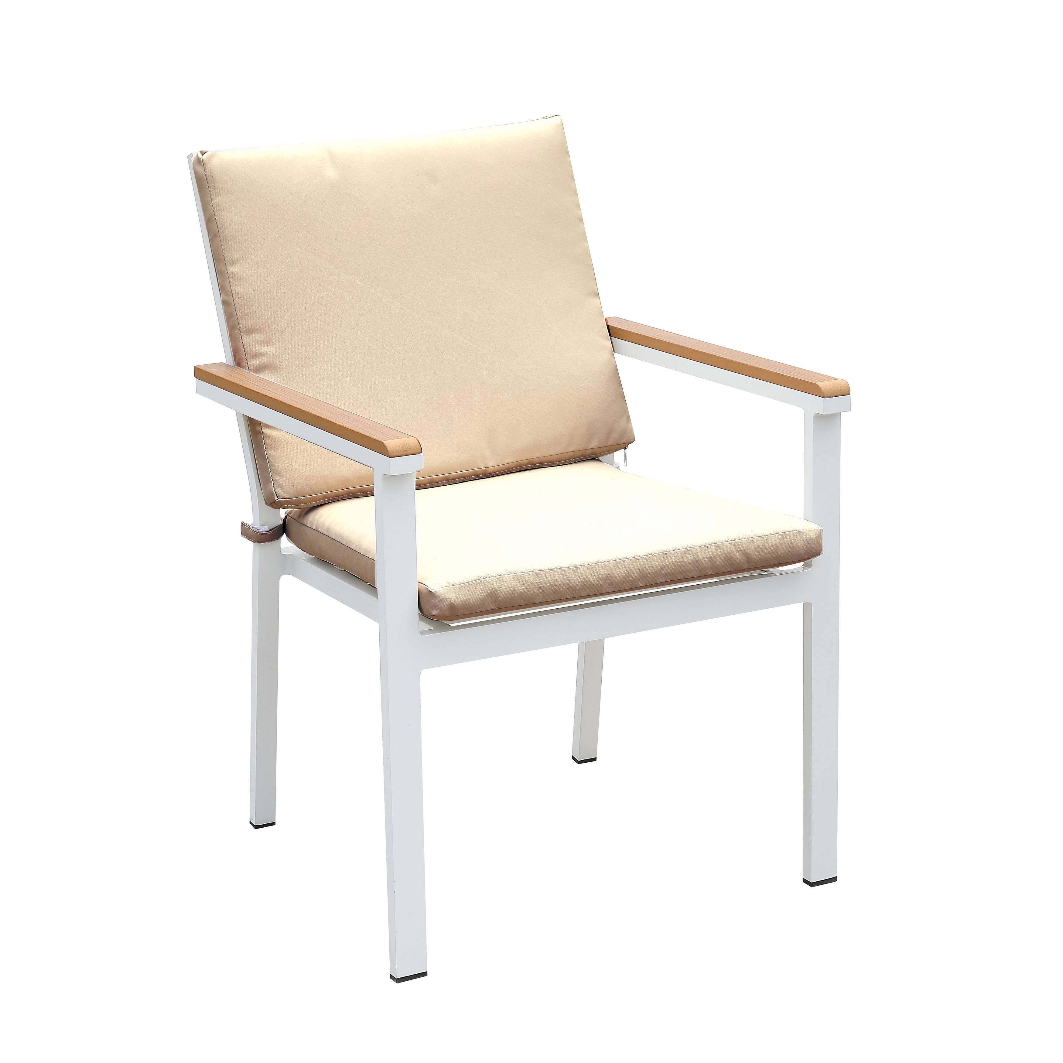 Patio Chairs, Set of 2. Transitional style Slatted chair Removable seat cushions White metal frame UV and water resistant White, Oak, Beige