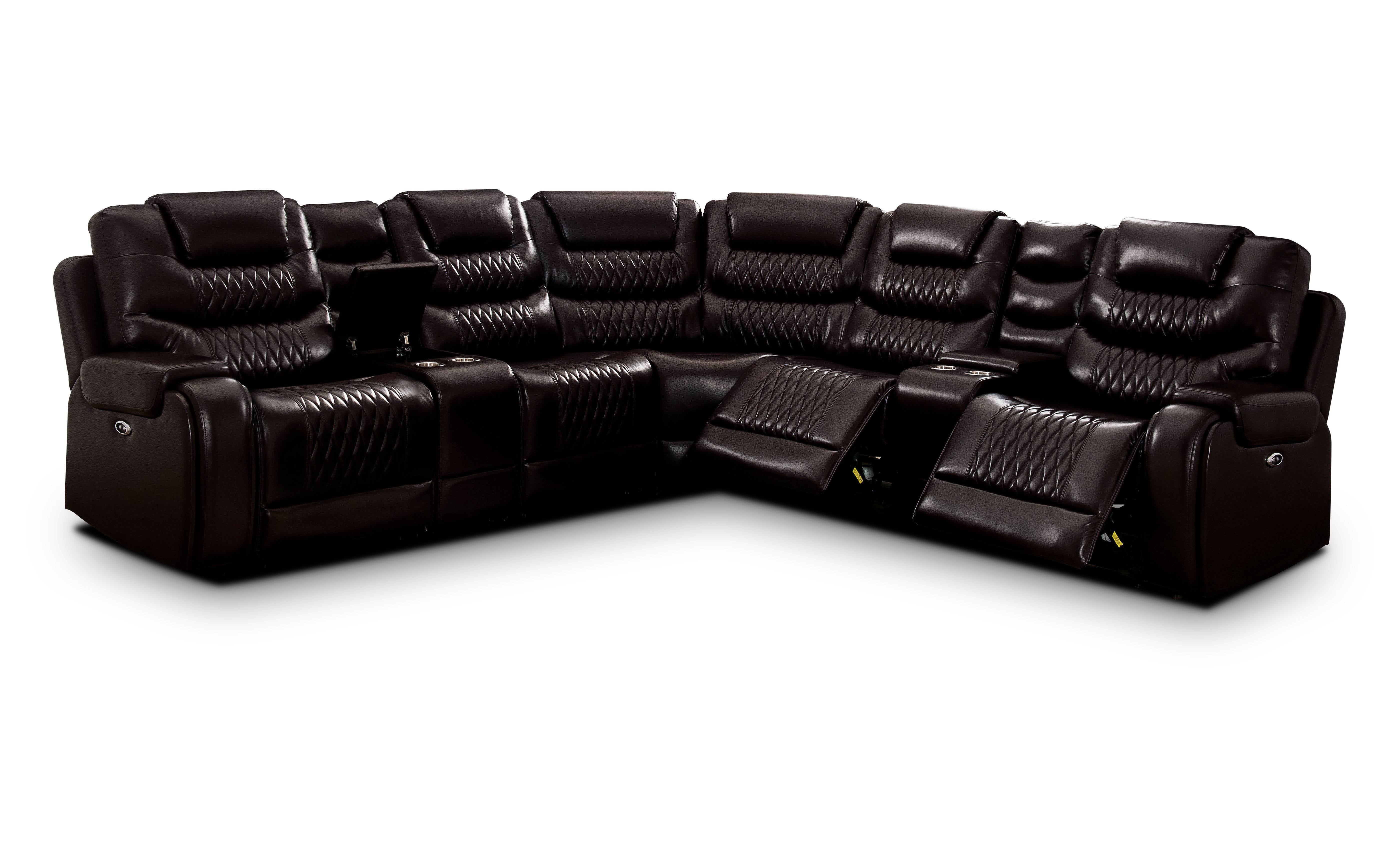 Transitional style, Sectional Luxurious and sleek reclining sectional provides exceptional comfort Supported on a platform base Built-in cupholders for beverages Hidden USB port to charge smart devices Brown
