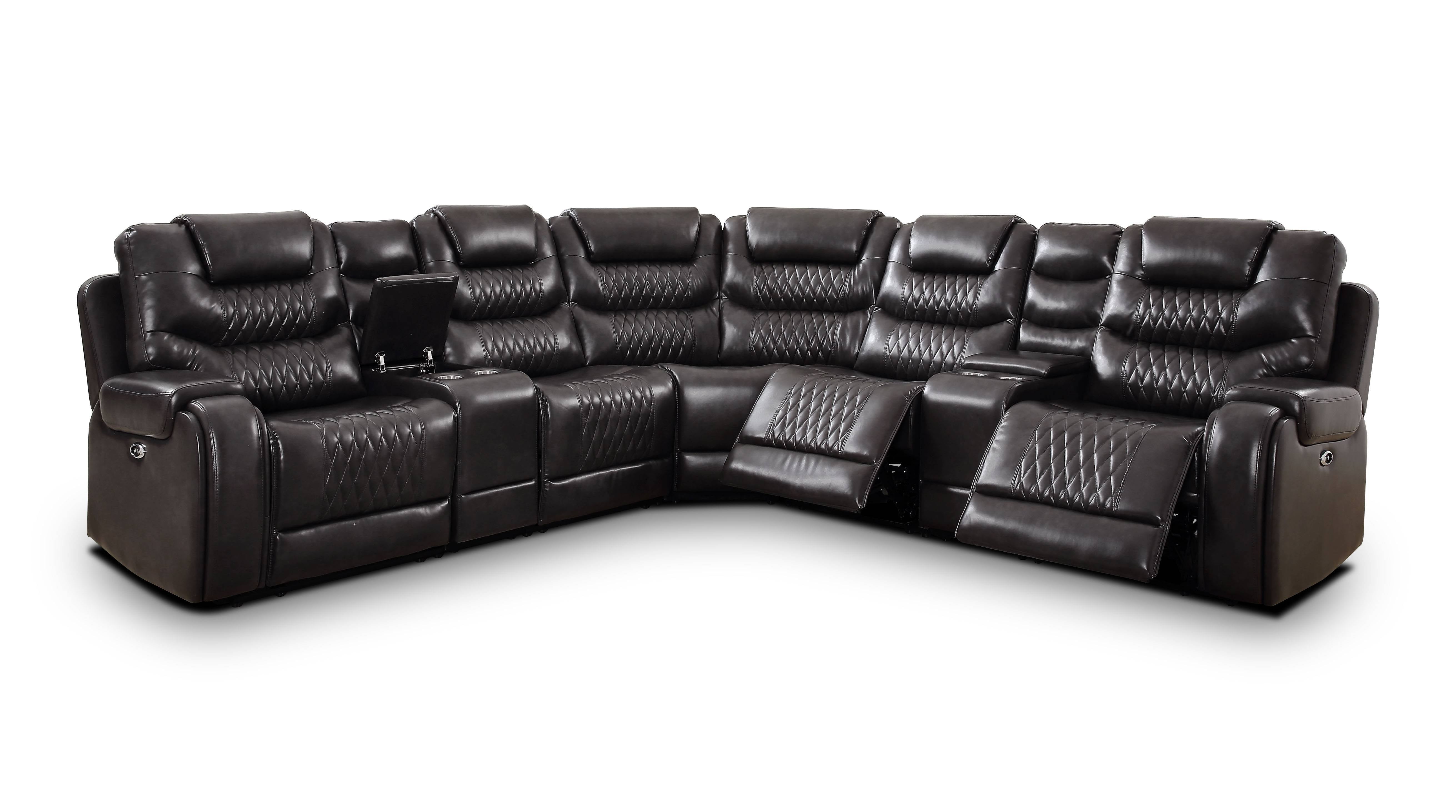 Transitional style, Sectional Luxurious and sleek reclining sectional provides exceptional comfort Supported on a platform base Built-in cupholders for beverages Hidden USB port to charge smart devices Gray
