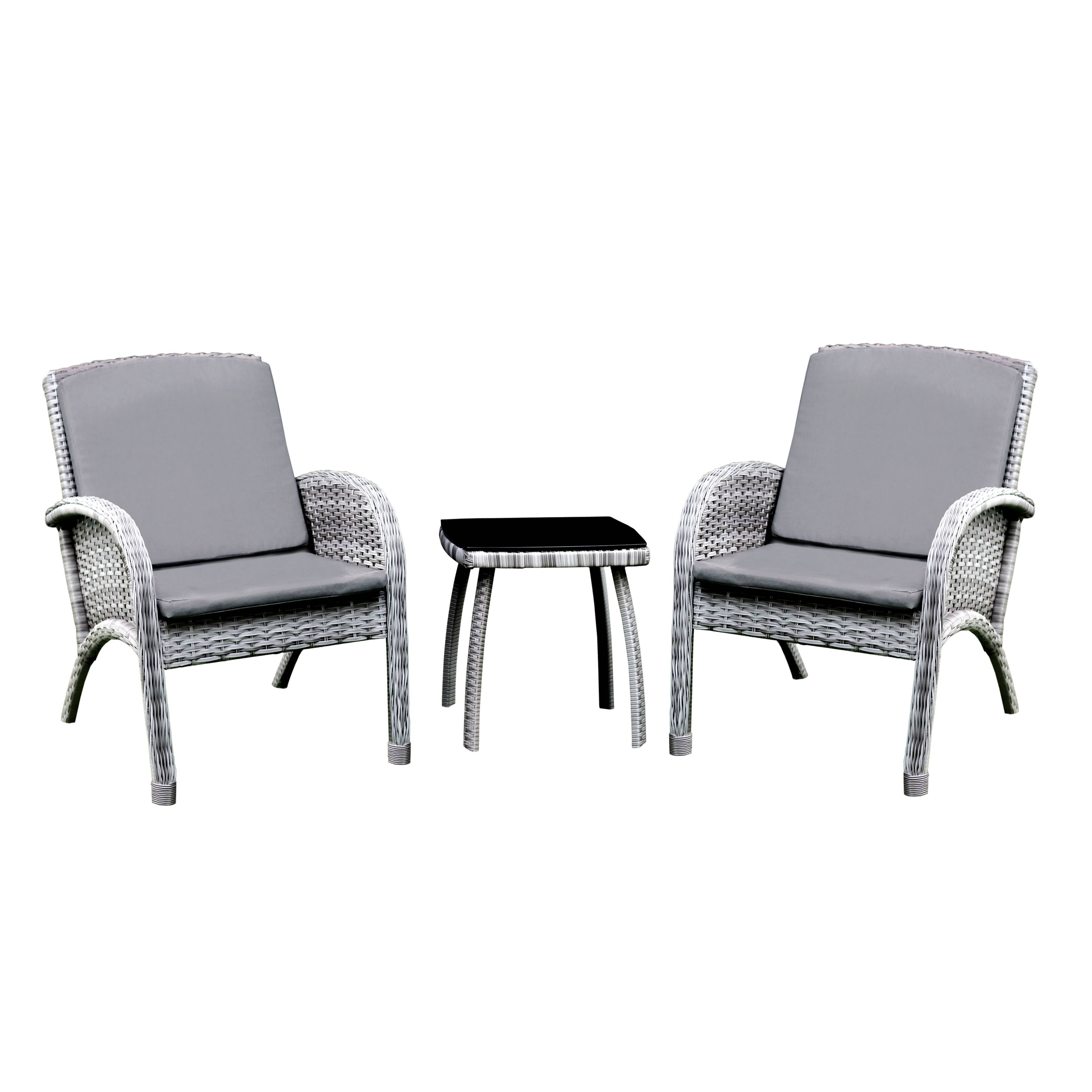 Patio Lounge Set. Transitional style Removable fabric padded seat cushion and pillow back Tinted tempered glass table top UV and water resistant Set includes one (1) table, two (2) chairs Gray, Gray, Black