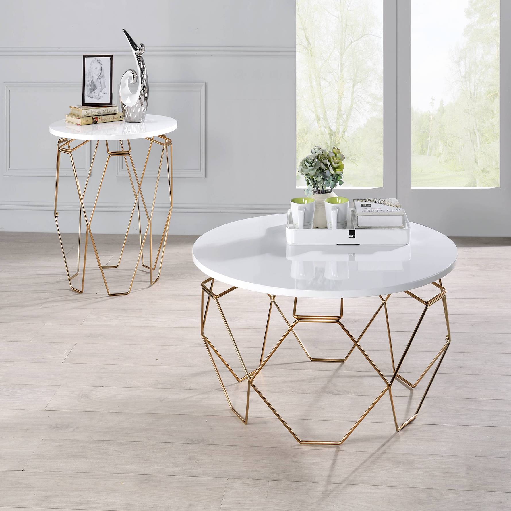 Coffee Table, Modern style Two-tone design Round table top Geometric metal base White, Gold